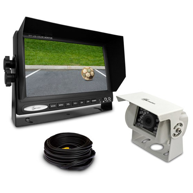 Monitor CM-MRFS7 navrhnutý špeciálne pre použitie na parkovacie kamerové systémy pracuje s napájacím napätím 12V až 32V. Takto je jeho využite široké či už v aute, karavanoch, dodávkach, nákladných autách alebo aj v poľnohospodárskych strojoch. TFT panel je riešený LED podsvietením čo šetrí nielen energiu ale v porovnaní s CCFL monitormi má omnoho kvalitnejšiu reprodukciu farieb. V prípade potreby je možné na panel pripevniť slnečnú clonu. Monitor má 4 Audio / Video vstupy čo umožňuje pripojiť až 4 kamery súčasne. Monitor disponuje tiež 3 x 12V výstupom pre napájanie kamier. K AV vstupom môžete samozrejme pripojiť aj iné Multimediálne jednotky ako DVD, DVB-T a iné. Monitor obsahuje tiež svetelný snímač ktorý obraz automaticky stmavne a rozsvietia sa tlačidlá na modro. Monitor umožňuje automatické prepínanie na kameru po zaradení spiatočky. Okrem toho je možné kamery prepínať aj ručne. Súčasťou balenia je montážny rám, stojan, kabeláž a diaľkové ovládanie. Sadá obsahuje parkovaciu kameru IR18 ktorej pozorovací uhol 120° zabezpečuje perfektné videnie z bezprostrednej blízkosti. 18 infračervených Led diód zabezpečuje perfektné snímanie aj v úplnej tme. Sadá obsahuje aj 15m dlhý multifunkčný kábel ktorý dáva možnosť rôznych typov pripojenia. Kamera môže fungovať nepretržite, alebo sa prepína automaticky po zaradení spiatočky.